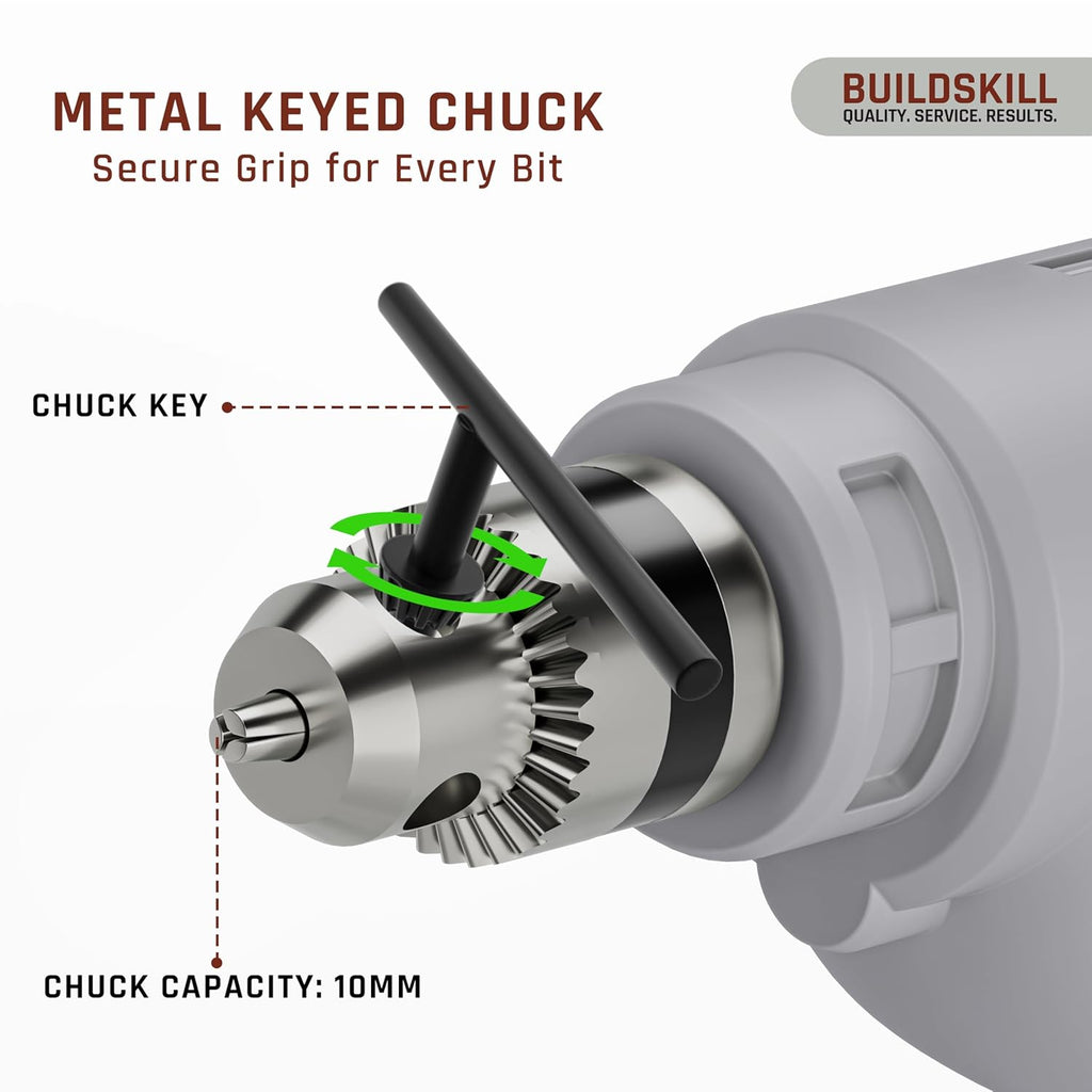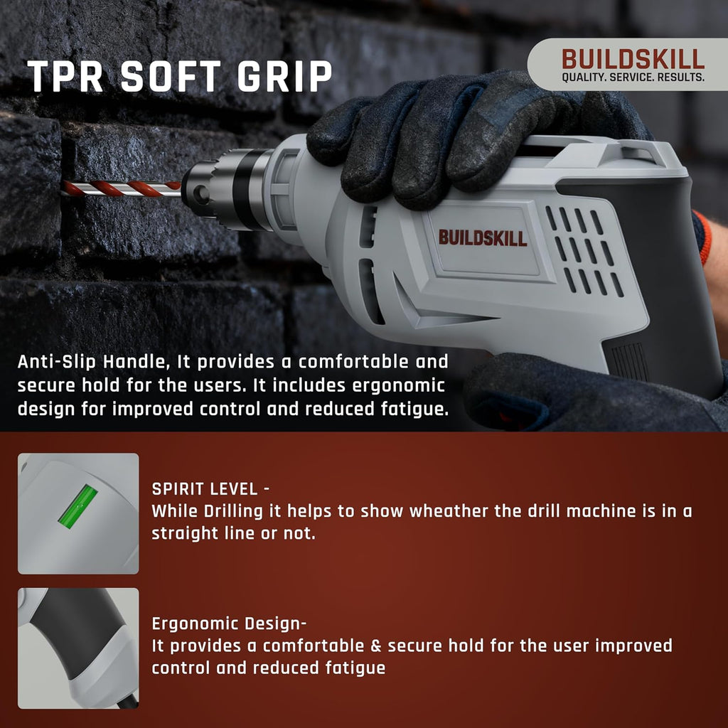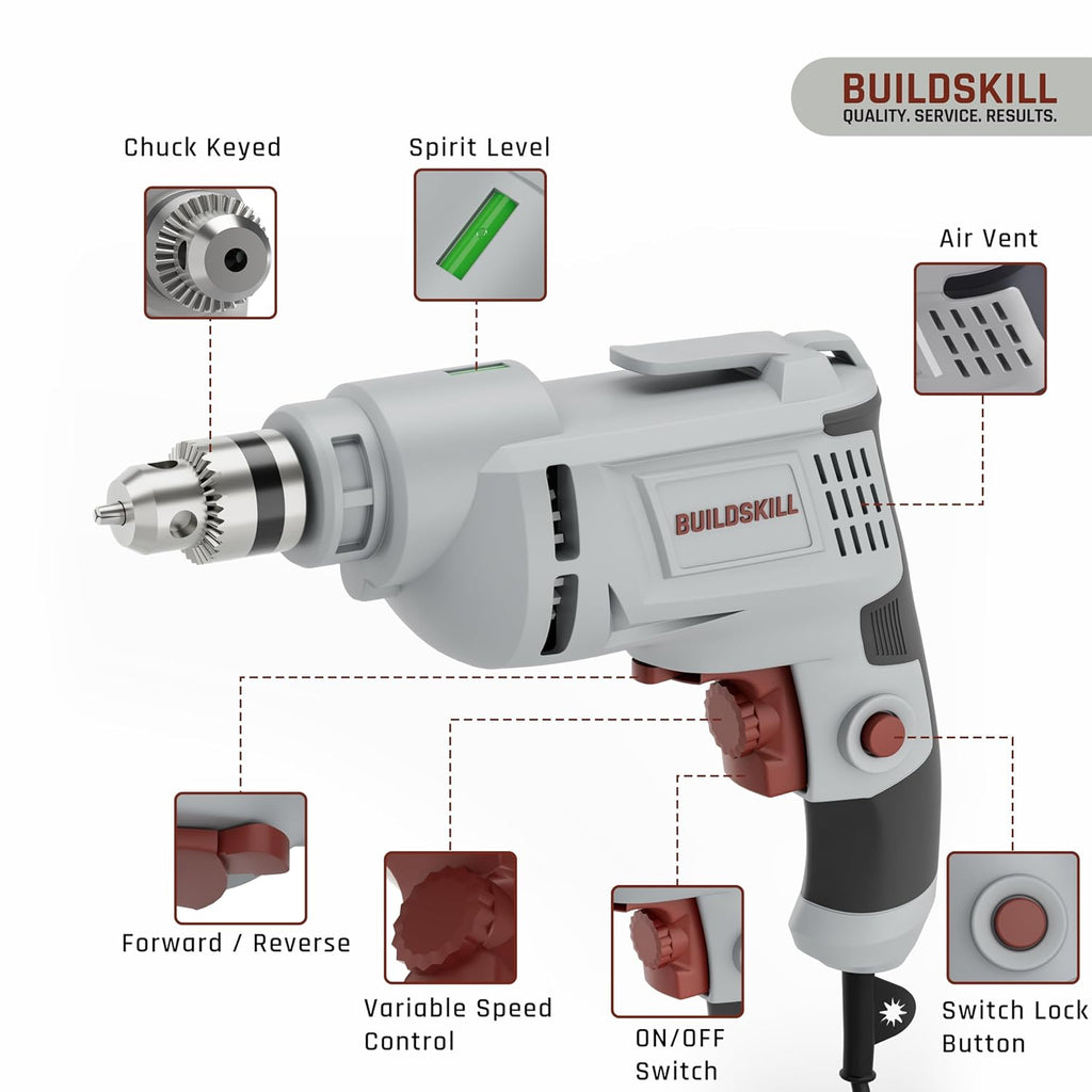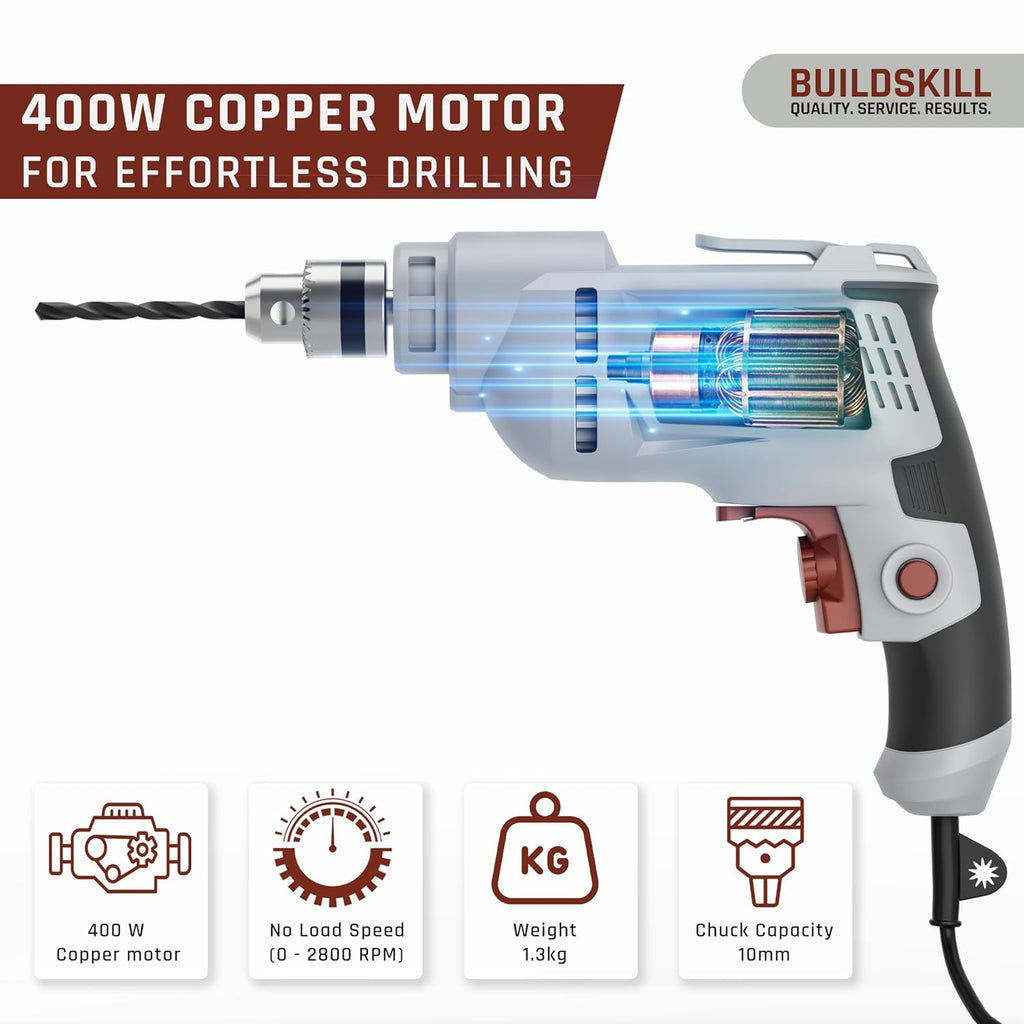 BUILDSKILL 400W Electric Drill Machine | 10MM Metal Chuck | 0-2800RPM Variable Speed | Forward-Reverse | Copper Motor | 7 Bits Set Electric Drill Machine for Wall Drilling | 1.8m Cable | Spirit Level