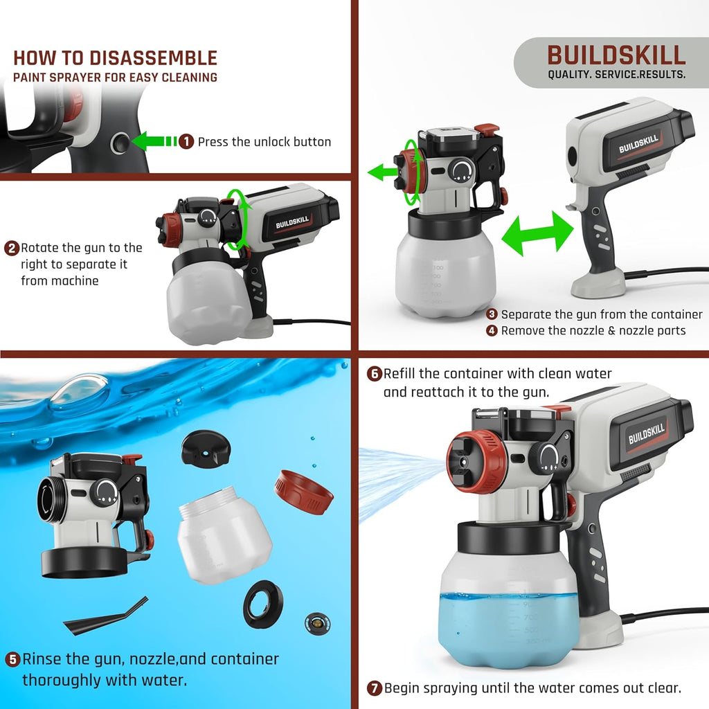 - Easy Disassembly for Quick Cleaning & Maintenance - Maintaining your paint sprayer is simple - detach the gun, remove the nozzle, and rinse all parts thoroughly. A clean sprayer ensures consistent performance and prevents clogging. Follow the step-by-step guide to disassemble, rinse, and reassemble in minutes.