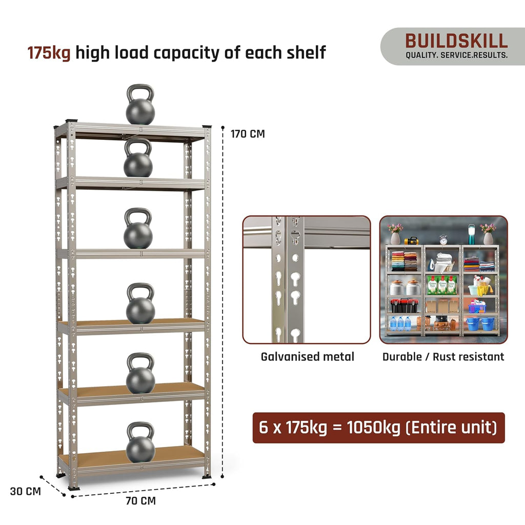 - Heavy-Duty Galvanized Metal, Holds Upto 175kg Each Shelf - Built to last with galvanized rust-resistant metal and 6 sturdy 4mm MDF boards. Each shelf supports up to 175kg, totalling an impressive 1050kg load capacity. Reinforced centre supports and non-slip foot pads ensure rock-solid stability. The size measurements are 170cm x 70cm x 30cm, making it a tough storage solution you can trust for any space - offers unmatched convenience and durability.