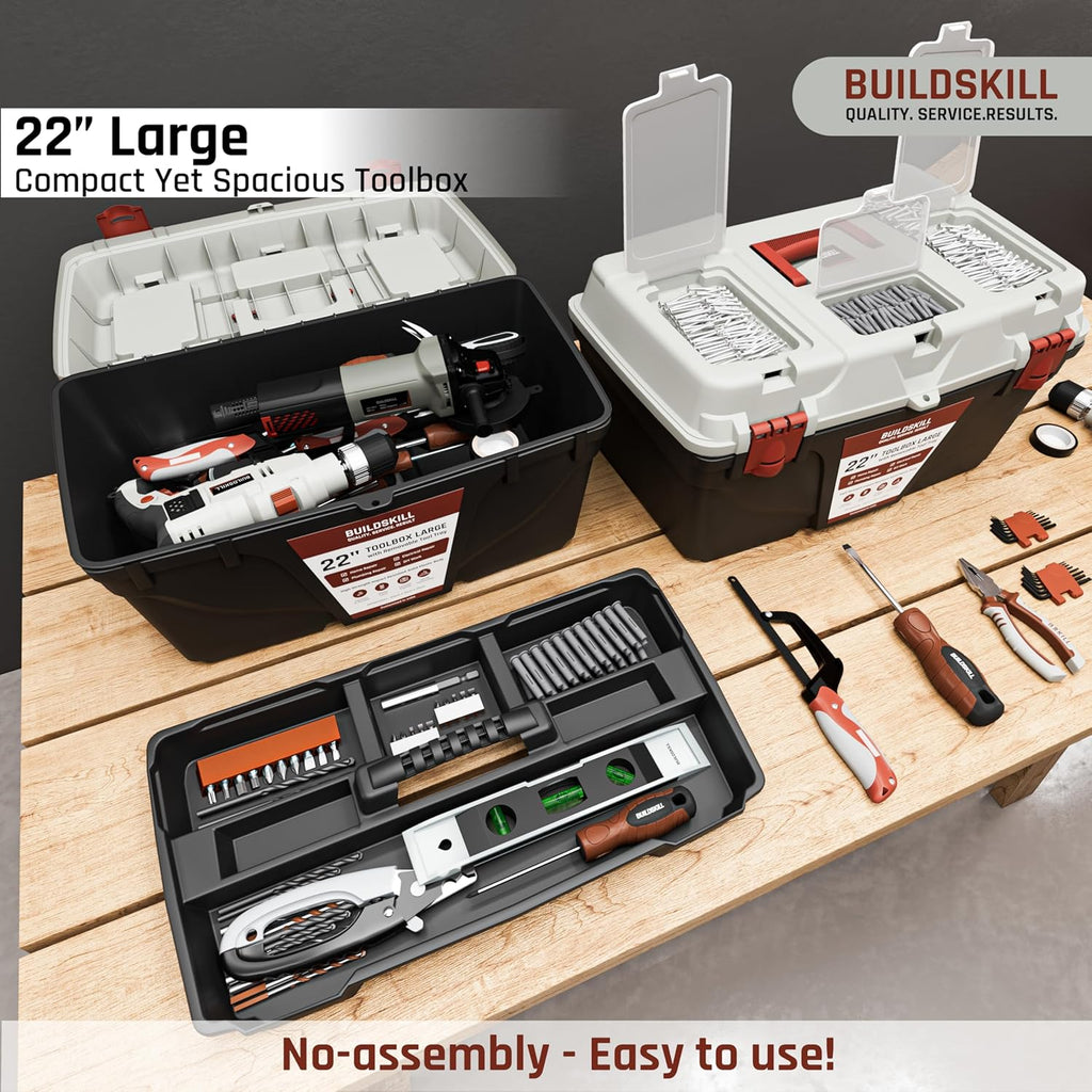 BUILDSKILL 22" Large Tool Box for Home | Convenient Top Lids & Removable Tool Tray | Secure Latch Lock | Key Hole | Heavy Duty Impact Resistant Body | Ideal Repair Toolbox for DIY & Professional Use