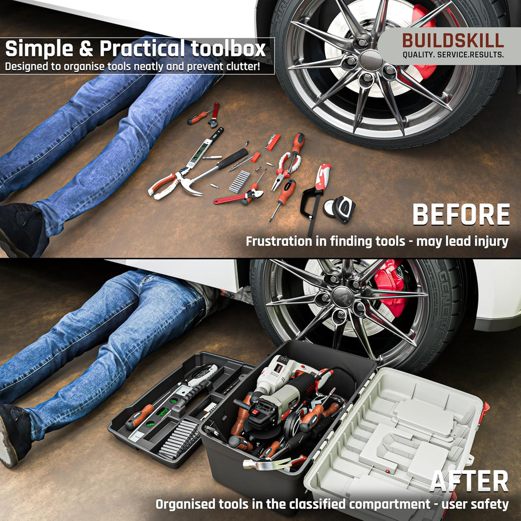 • Durable, High-Quality Plastic Construction - Engineered for strength, this toolbox is made from impact-resistant, high-strength plastic built to withstand daily wear and tear. The Buildskill plastic tool box rugged construction ensures long-term durability, even under tough working conditions. Whether you're a carpenter, mechanic, or painter, this toolbox delivers lasting performance you can count on -day after day.
